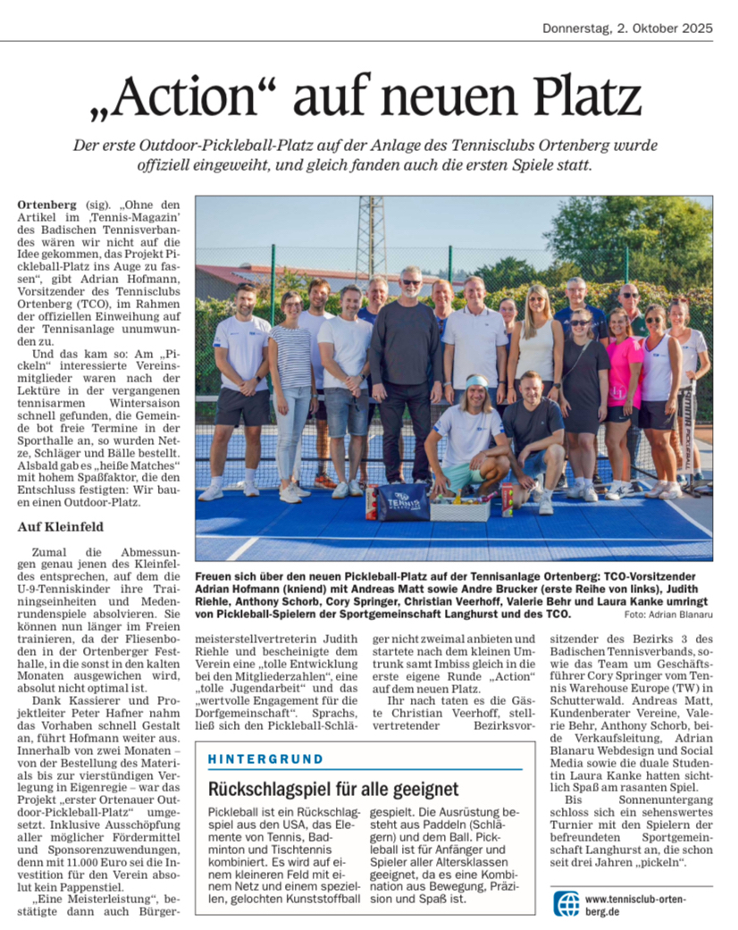Der erste Outdoor-Pickleball-Platz auf der Anlage des Tennisclubs Ortenberg wurde offiziell eingeweiht – und gleich fanden auch die ersten Spiele statt.